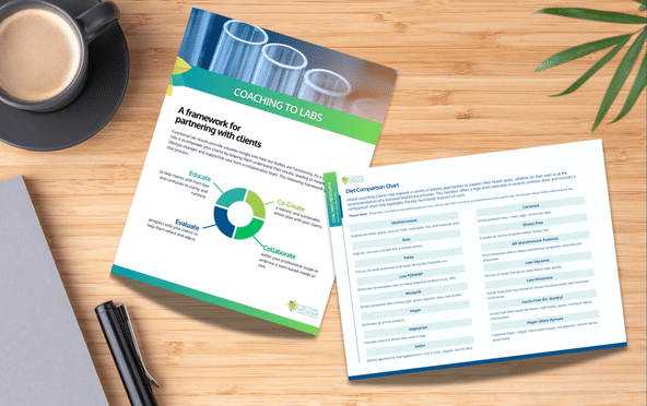 - Functional medicine handouts including diet comparison charts, lab marker glossaries, and more